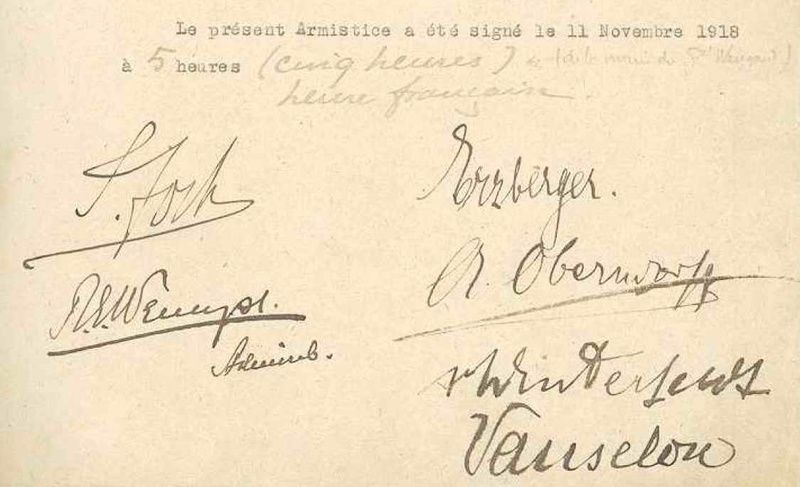 L’Allemagne a quinze jours pour l’évacuer la France, la Belgique, le Luxembourg et I'AIsace-Lorraine, trente-et-un jours pour abandonner aux Alliés la rive gauche du Rhin, la tête de pont de Coblence, Cologne et Mayence. De plus, l’Allemagne se doit de déposer les armes et de doit livrer 5 000 canons, 25 000 mitrailleuses, 17 000 avions, à renoncer aux traités de Brest-Litovsk et de Bucarest. À 5 heures du matin, le 11 novembre, une discussion s’engage ; les Allemands signent la convention consacrant leur défaite.